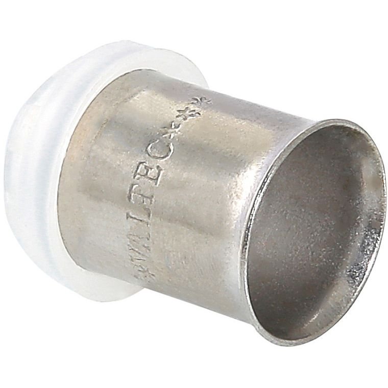 (VTm.290.N) Гильза с обоймой-фиксатором для пресс-фитинга VALTEC. Материал гильзы – пластичная нержавеющая сталь марки AISI 304, обоймы-фиксатора – нейлон PA 6. Гильза имеет монтажный раструб. Конструкция фиксатора обеспечивает правильное расположение пресс-насадки инструмента на соединителе, контроль полноты одевания металлополимерной трубы на штуцер, отсутствие электрического контакта алюминиевой прослойки трубы и латунного корпуса фитинга. Усилие обжатия гильзы – не более 1200 Н.