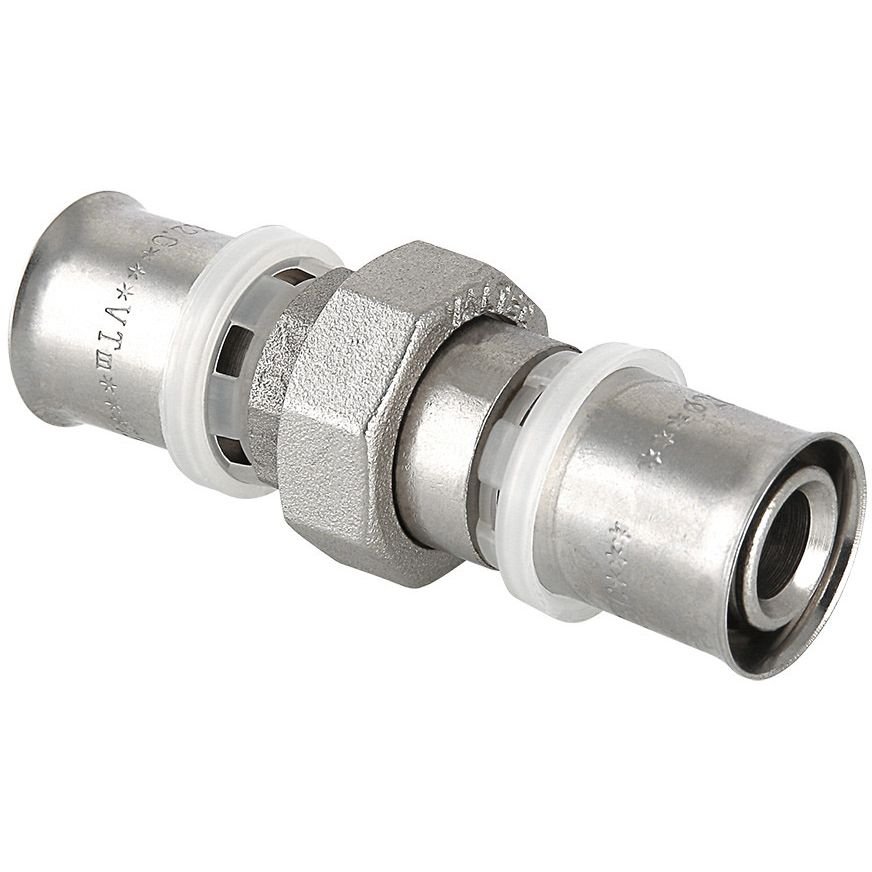 (VTm.263.N) Прямой равнопроходной пресс-фитинг для создания разъемного соединения на трубопроводе из металлополимерных труб (металлопластиковых труб) или труб из сшитого полиэтилена. Состоит из двух пресс-деталей: с переходом на наружную резьбу и с накидной гайкой.